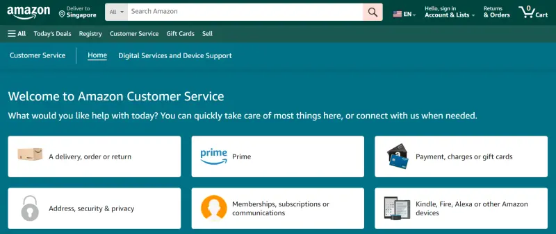 当你向下滚动亚马逊的知识库时,你会看到它涵盖了广泛的主题。知识库中的信息从广泛的主题开始,然后提供更详细的信息,包括退货、退款和运输政策等。知识库中的信息被整齐地组织起来,方便客户快速浏览和导航到所需页面。中央位置的搜索栏可以帮助客户快速找到所需的信息。