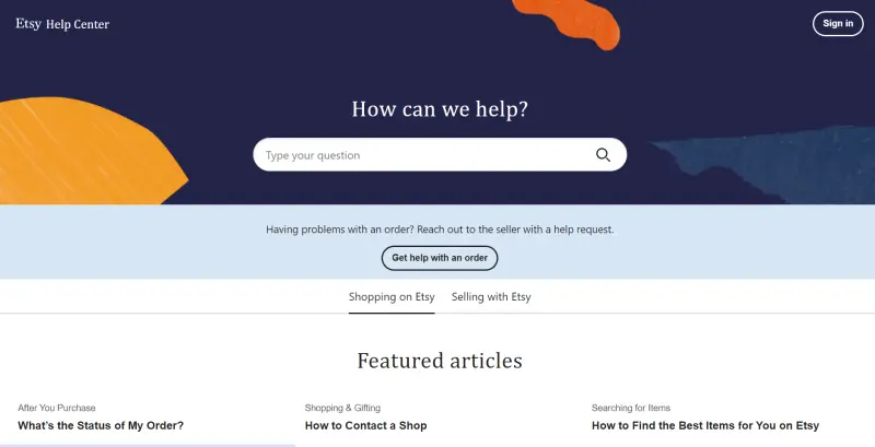 Etsy的知识库具有美观的设计和用户友好的结构,迎合了购物者和卖家的需求。在搜索栏下面,您可以找到常见的帮助主题,其次是关于用户账户和订单的文章。Etsy优先考虑人工客服,因此客户还可以寻求订单的帮助,或在需要时直接与代表联系。