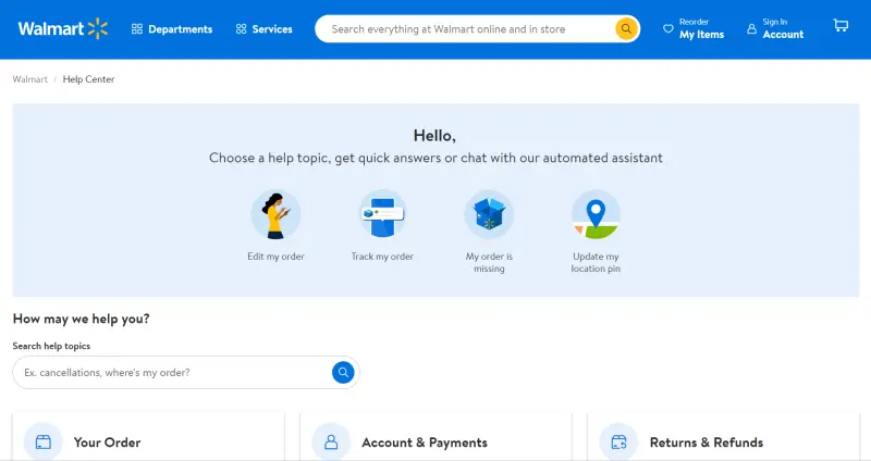 沃尔玛的知识库非常广泛,它优先考虑优质信息而不是华而不实的设计。它提供了一系列资源,包括常见问题解答、帮助文章和人工客服。凭借便捷的搜索栏和突出显示的主要类别,沃尔玛确保为客户提供无忧无虑的浏览体验。