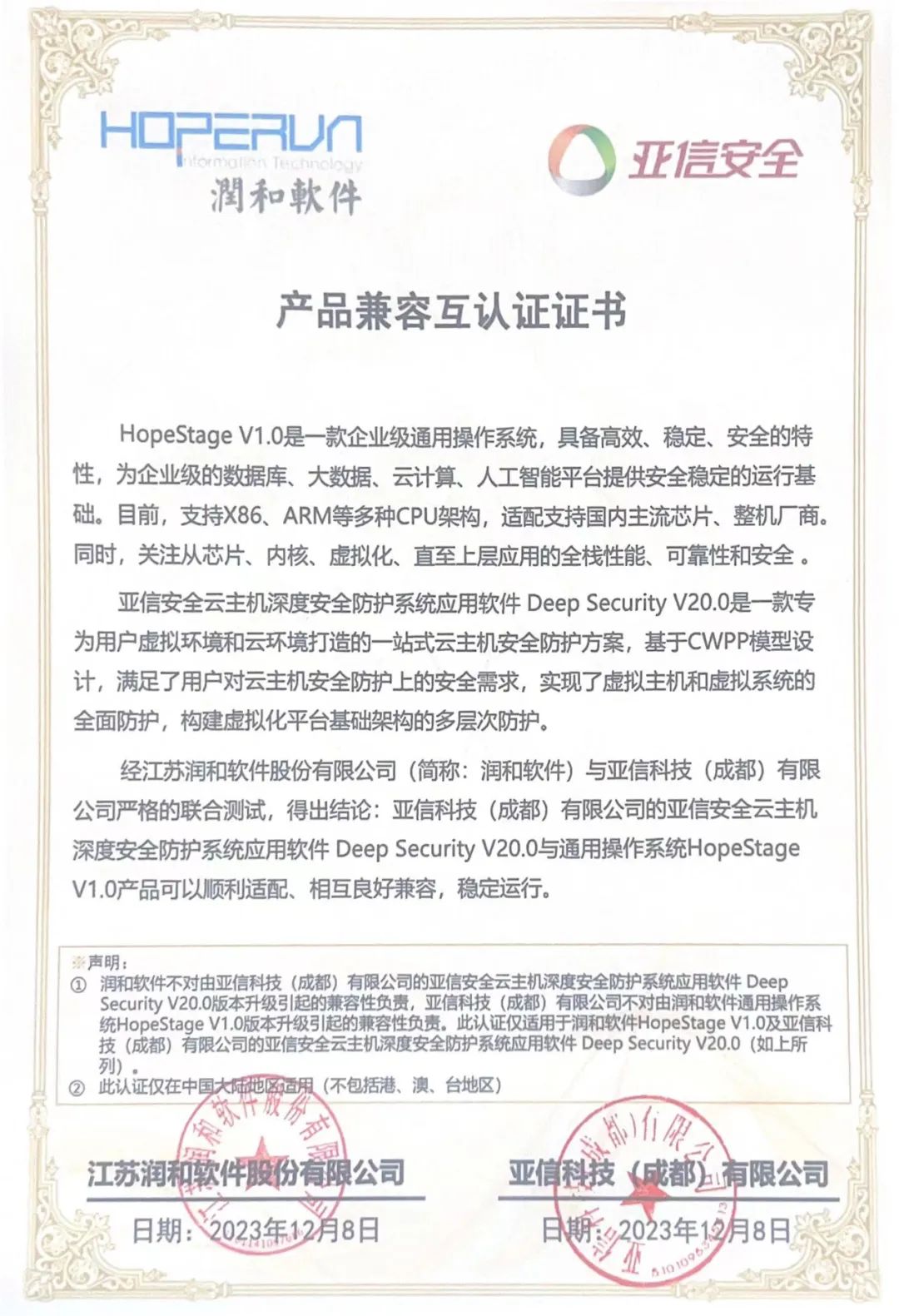 近日,江苏润和软件股份有限公司(以下简称“润和软件”)HopeStage 操作系统与亚信科技(成都)有限公司(以下简称“亚信安全”)云主机深度安全防护系统完成兼容性测试。