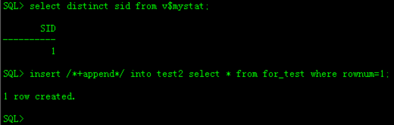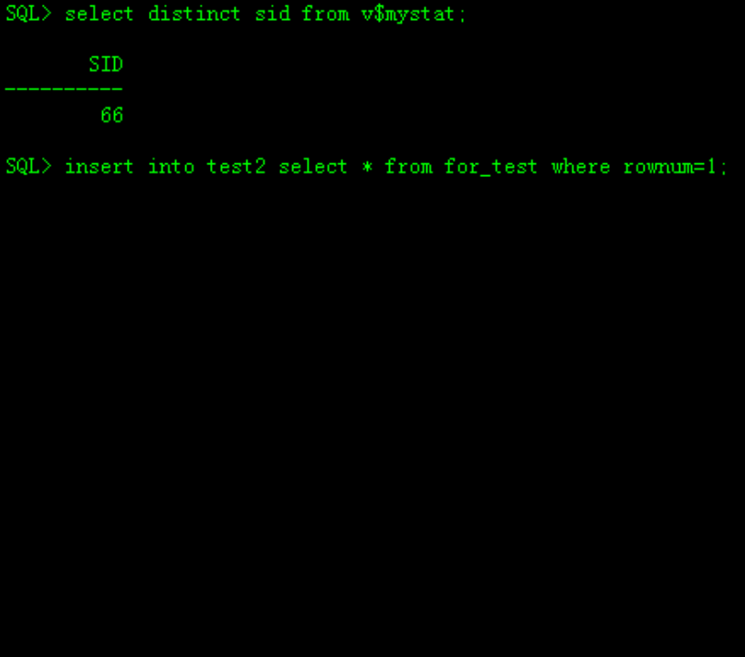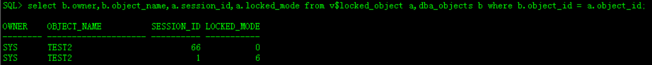 从上面可以看到sid为1的会话使用了append向test2的表插入1行后没commit或者rollback,然后我在sid为66的会话想再插入一行,发现一直堵塞无法完成,查锁发现TEST2这表加上了”6”类型的锁。如果没用使用append则其它会话可以正常insert,就不做测试了。