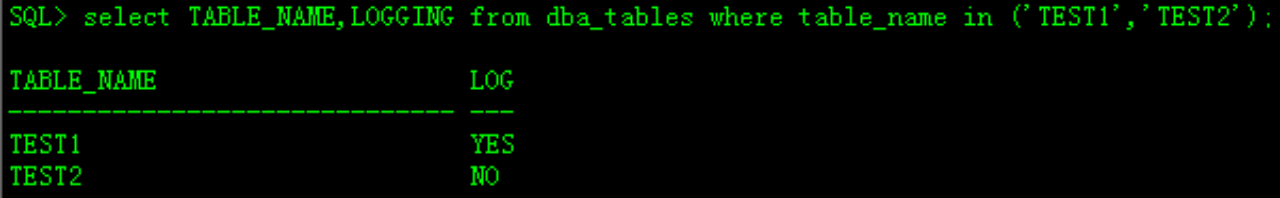 本次测试中的2个表test1和test2,test1是默认的logging模式,test2设置成nologging模式。