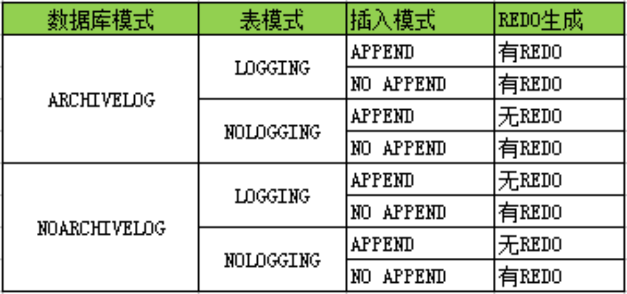 (2)NOLOGGING与表模式,插入模式,数据库运行模式(archivelog/noarchivelog)的关系: