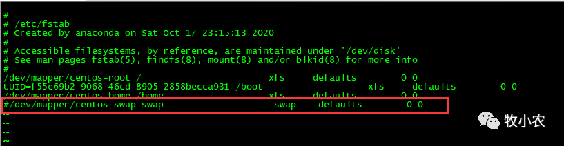 修改配置文件,永久关闭交换区:vi/etc/fstab