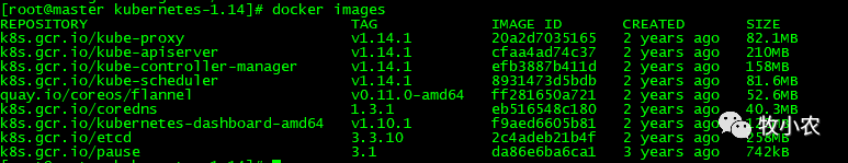 [root@master kubernetes-1.14]# docker imagesREPOSITORY TAG IMAGE ID CREATED SIZEk8s.gcr.io/kube-proxy v1.14.1 20a2d7035165 2 years ago 82.1MBk8s.gcr.io/kube-apiserver v1.14.1 cfaa4ad74c37 2 years ago 210MBk8s.gcr.io/kube-controller-manager v1.14.1 efb3887b411d 2 years ago 158MBk8s.gcr.io/kube-scheduler v1.14.1 8931473d5bdb 2 years ago 81.6MBk8s.gcr.io/coredns 1.3.1 eb516548c180 2 years ago 40.3MBk8s.gcr.io/etcd 3.3.10 2c4adeb21b4f 2 years ago 258MBk8s.gcr.io/pause 3.1 da86e6ba6ca1 3 years ago 742kB
