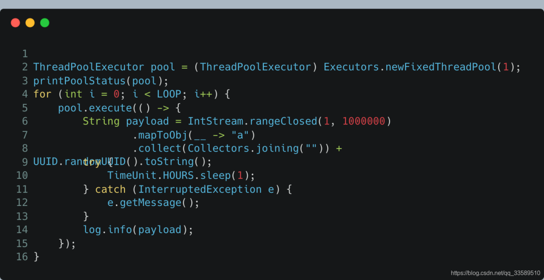 这文件批处理程序,在程序启动后通过一个线程开启死循环逻辑,不断向线程池提交任务,任务的逻辑是向一个文件中写入大量的数据。可以想象,这个线程池中的2个线程任务相当重。