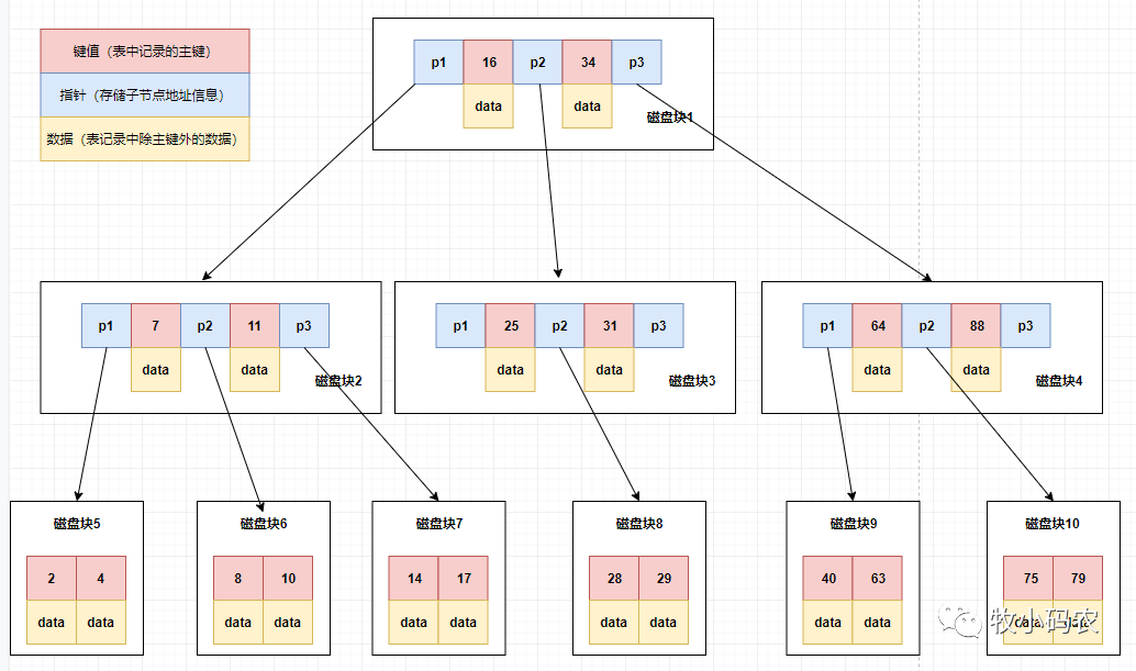 每个节点占用一个磁盘块,一个节点上有两个升序排序的关键字和三个指向子树根节点的指针,指针存储的是子节点所在磁盘块的地址。两个关键词划分成的三个范围域对应三个指针指向的子树的数据的范围域。以根节点为例,关键字为16和34,P1指针指向的子树的数据范围为小于16,P2指针指向的子树的数据范围为16~34 ,P3指针指向的子树的数据范围为大于34。