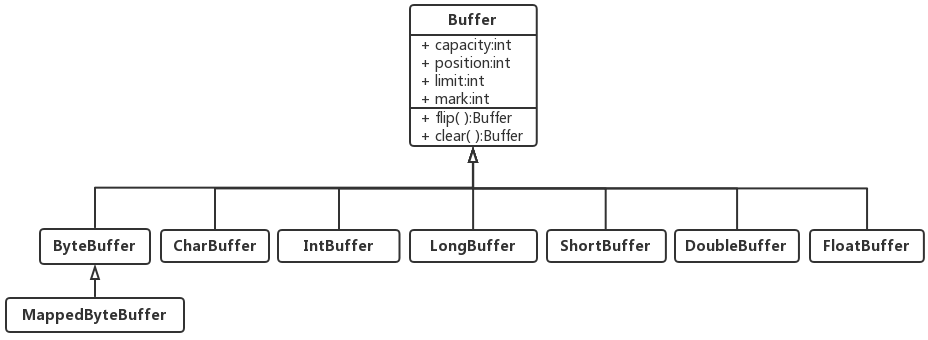 Buffer 常见类型: ByteBuffer 、 MappedByteBuffer 、 CharBuffer 、 DoubleBuffer 、 FloatBuffer 、 IntBuffer 、 LongBuffer 、 ShortBuffer 。