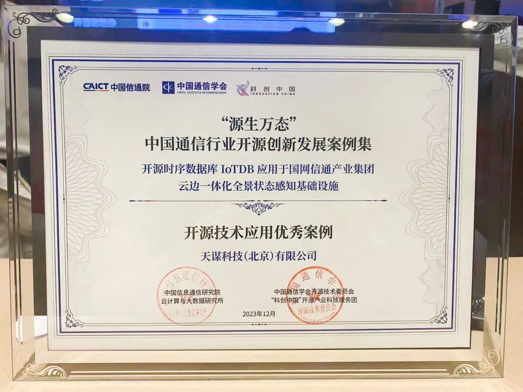 案例征集聚集了中国移动通信研究院、中国联通软件研究院等企业参与,经过案例编委会专家多轮评审,最终评选出 8 家企业的 11 个具有参考价值的开源技术应用案例。其中天谋科技团队研发的时序数据库 IoTDB,应用于国网信通产业集团云边一体化全景状态感知基础设施案例,成功入选开源技术应用优秀案例。
