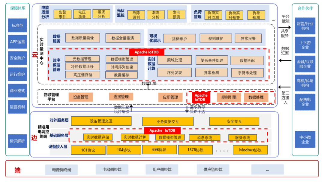 为实现新型电力系统建设,基于物联网时序数据库 IoTDB 强大的产品特性,国网信通产业集团完成了支持多协议接入和数据实时处理的精准用电调控终端、物联管理平台及实时量测数据中心等产品,搭建了云边一体化全景状态感知基础设施。同时,在用电各智能业务终端,如充电场站、光伏场站等,基于 IoTDB 实现的全景数据管理基座,国网信通产业集团设计了实时监测预警,协同调控、发电预测、电能质量监测等应用,打造了“技术先进、架构坚强、应用灵活、提升全面”的分布式新能源协同调控系统。IoTDB 协助覆盖电力行业数据采集、缓存、汇聚、存储、计算、共享及可视化展现,支持端边云协同的电力实时数据全生命周期管理,有力支撑新型电力系统达到实时感知、全域计算、协同联动的业务目标。