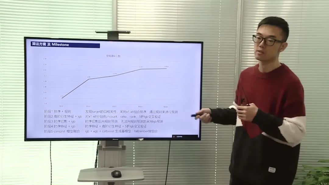 该团队的比赛方案主要分为三个阶段。在第一阶段中,团队成员通过观察数据,使用基本的排序和规则方法,得到了0.82的分数。在第二阶段中,团队成员使用多维度特征衍生的方法,得到了0.89的分数。在第三阶段中,团队成员将规则特征转换为可用的模型特征,并与其他特征进行融合,最终达到了0.93的分数。在最后一个阶段中,团队成员通过探索不同的模型和分数,使用客户端池进行搜索,稍微提高了分数,达到了0.933。