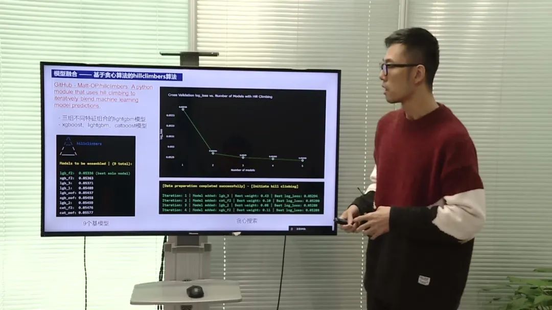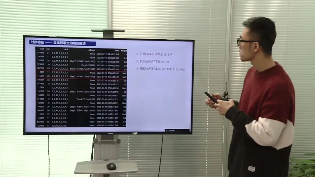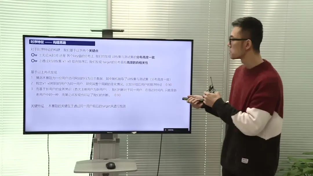 团队成员在特征工程方面表现出色,通过对数据的观察和洞察,发现了数据中的关键特征。他们发现训练集和测试集在不同维度和键值上的分布高度一致,推测它们来自同一元数据级别。他们还发现在用户特征X1到X8中,通过组合排序后,相同特征值的目标值具有高度的自相关性。团队成员利用这些洞察,设计了一些规则和特征,从而提高了模型的预测能力。