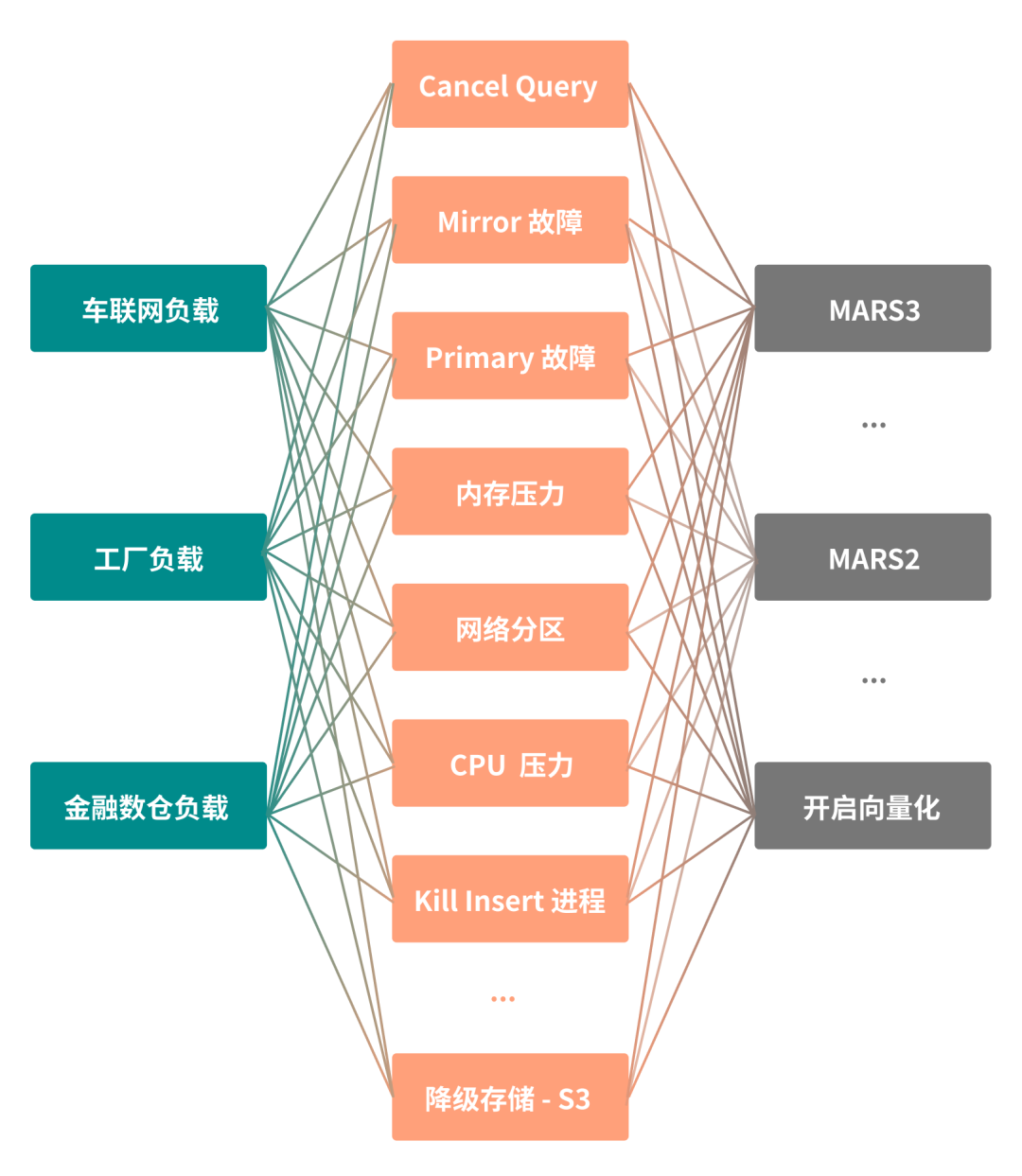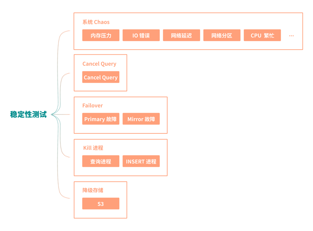 对于稳定性测试,YMatrix 针对其特性,结合混沌工程的思想设计了大量的混沌测试用例,如下图所示: