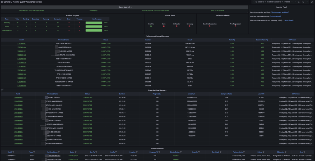可以看到,Grafana 中提供了 Workload 的运行状态、运行时间、数据库的版本、以及其他一些有用的信息。当运行出现故障,或者结果没有符合预期,也会在 Grafana 中展示出来,方便我们去排查和定位问题。
