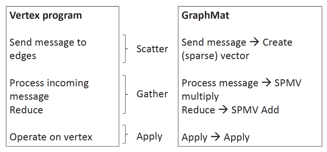 GraphMat中点中心的图计算框架仍然采用GAS模型,其与底层的矩阵计算的对应关系如图所示。Scatter操作为通过边发送消息,对应的矩阵操作为创建向量。Gather操作为对从边传递过来的消息进行处理,对应的矩阵操作为矩阵乘法以及按位计算操作。Apply操作为更新当前顶点的信息,在矩阵操作中对应的是对矩阵中的元素进行修改。