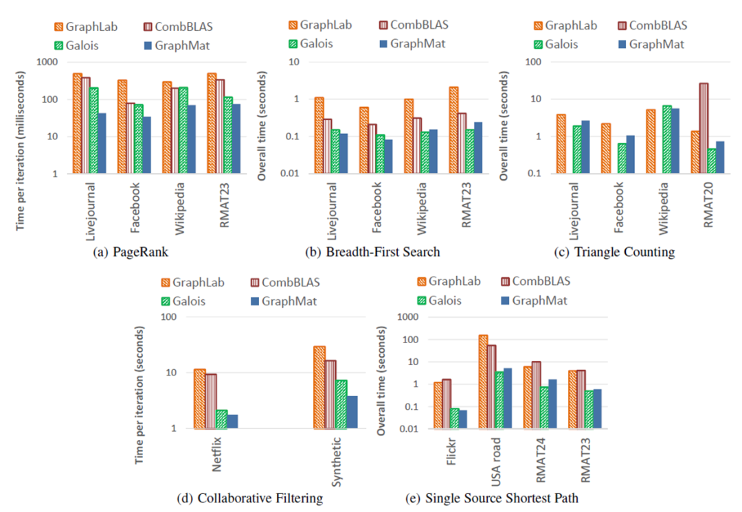 从实验结果中不难发现,GraphMat与此前的方法相比有较大的性能提升。比GraphLab平均快5.8x, 比CombBLAS平均快6.9,比Galois平均快1.2,但TC(三角形计数)和SSSP(单源最短路径)更慢,而PageRank算法上的优势最为明显。