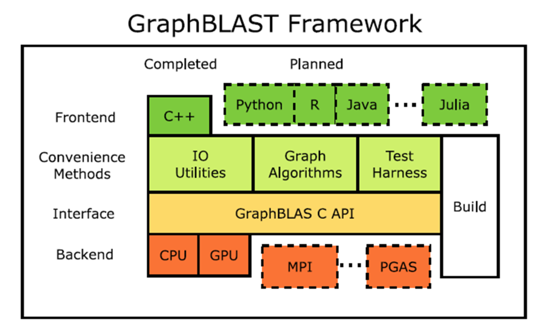GraphBLAST的框架层次如图所示。它兼容C++编程语言,为用户提供IO、算法和测试的接口。在底层它实现了GraphBLAS API,能够支持CPU和GPU两种底端实现。