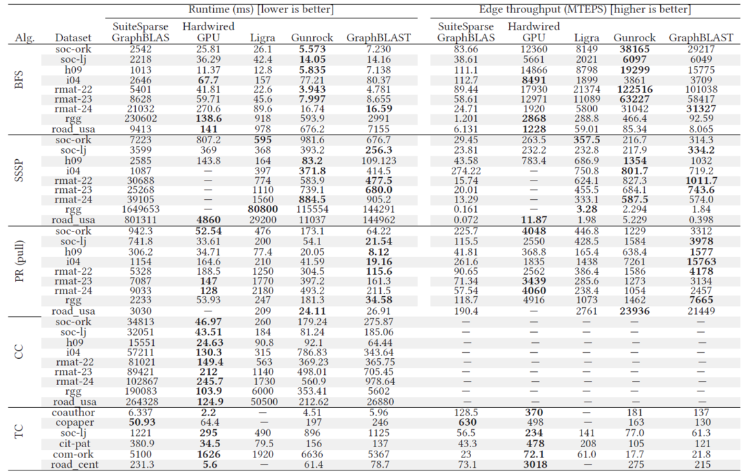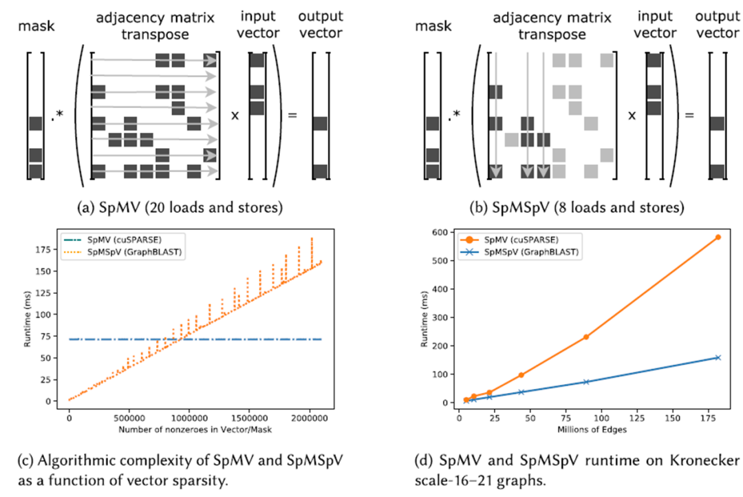 GraphBLAST的相关论文发表在期刊TOMS 2022上。其主要贡献为提供了一种GraphBLAS API在GPU上的高效实现。它提出了一个代价模型来选择不同的算法以处理不同稀疏程度的矩阵和向量。它还第一次考虑到了输出数据的稀疏性,引入了一种masking的实现方法。最后,它在访存模式和负载均衡上也提出了相关的优化方法。