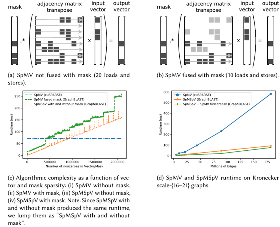 除了输入向量以外,输出的稀疏性也对图计算框架实现有影响。在不同的图算法中,通常需要对结点进行某种过滤和选择。GraphBLAST将这一操作称为masking操作:在不同的算法中,masking可以用来实现不同的步骤。例如,BFS中,对visited数组进行检查可以实现成masking,在SSSP中,masking可以用于将在这一轮中被更新的active的结点筛选出来,在PageRank中,可以用于判断每个点的PR值是否收敛。