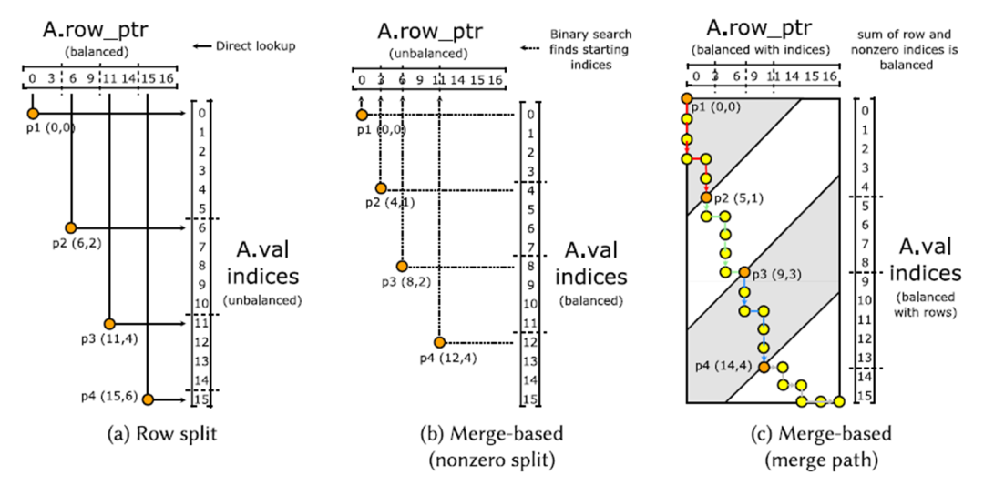 第三种是基于merge path的方法,具体做法是将row_ptr和A.val两个作为列表执行归并,然后将这条路径上的点平均分配给每个线程,然后找到切分点的下标。这种做法能够使得行和非零值都比较平均。