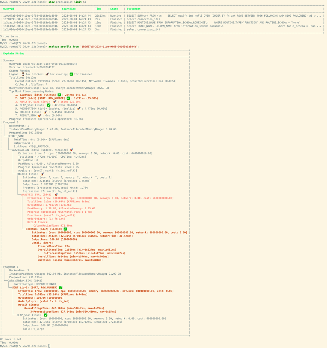 新增 Runtime Profile[12],以及基于文本的 Profile 分析指令[13](SHOW PROFILELIST, ANALYZE PROFILE, EXPLAIN ANALYZE),用户可以通过 MySQL 客户端进行 Profile 分析,能够直接知道最耗时的操作是哪些、分别占比多少,还可以通过在参数中指定节点来进一步获取更细节的资源消耗信息,方便定位瓶颈点并发现性能优化机会。这些功能也已合入到 3.1 版本。