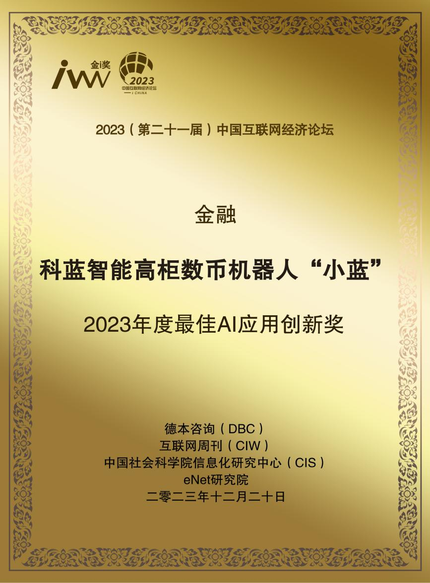 12月20日,由中国科学院《互联网周刊》、中国社会科学院信息化研究中心、eNet研究院、德本咨询联合主办的2023第二十一届中国互联网经济论坛“2023金i奖”榜单发布。该奖项旨在关注国产软件、信创、工业互联网、数字经济、专精特新等领域做出突出贡献的企业,科蓝软件凭借完全自研的智能高柜数币机器人“小蓝”在银行网点智能化转型进程中的大规模应用,荣获金融领域2023年度最佳AI应用创新奖。