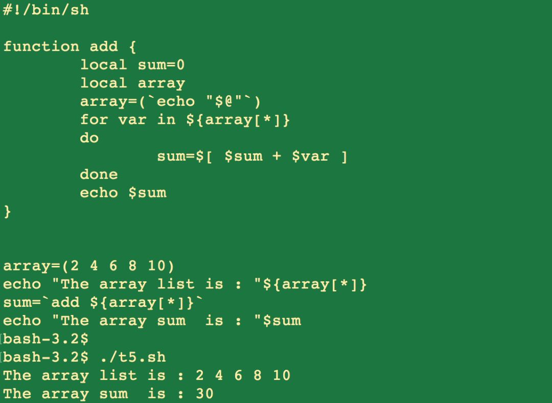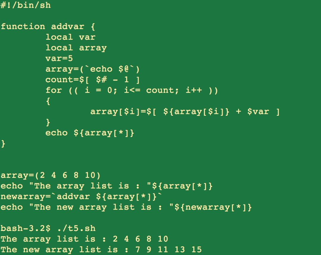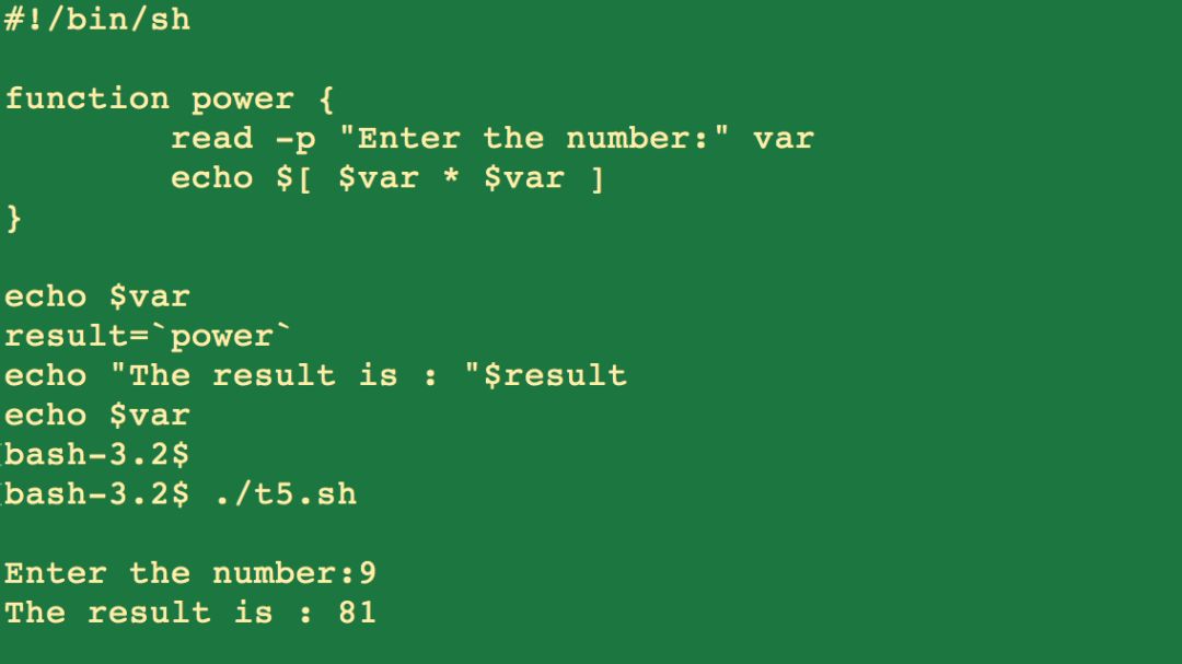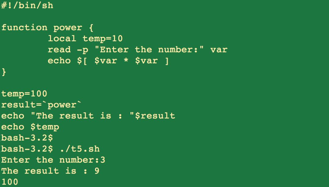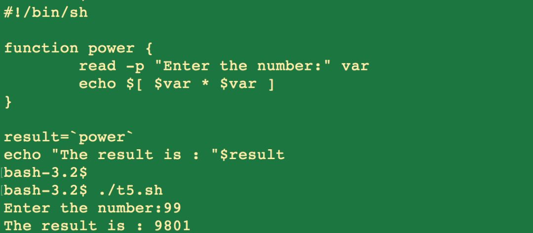 正如同可以将命令的输出保存到shell变量中一样,我们也可以将函数的输出保存到shell变量中: