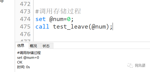 delimitercreate procedure test_leave(in num int)leave_label:beginif num<=0then leave leave_label;elseif num=1#num=1 跳出程序体then select avg(salary) from employees;elseif num=2#num=2 查出最低的工资then select min(salary) from employees;else#num等于其它,查出最大的工资select max(salary) from employees;end if;#查询总人数select count(*) from employees;enddelimiter ;
