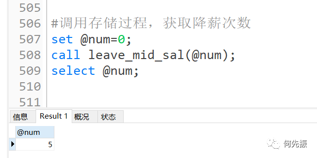 delimitercreate procedure leave_mid_sal(out num int)begin#声明变量#记录平均工资declare avg_sal double;#记录循环次数declare while_count int default 0;#获取初始平均工资select avg(salary) into avg_sal from employees;while_label:while true do#如果平均工资减到小于等于10000退出循环体if avg_sal<=10000then leave while_label;end if;#降薪update employees set salary=salary*0.9;#累加set while_count=while_count+1;#重新赋值平均工资select avg(salary) into avg_sal from employees;end while;#赋值set num=while_count;enddelimiter ;