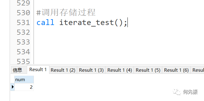 delimiter //create procedure iterate_test()begin#声明变量declare num int default 0;#使用loop循环loop_label:loop#累加set num=num+1;#判断#偶数,并且小于20就查询if num%2=0 and num<=20 then select num;#大于20结束循环elseif num>20 then leave loop_label;#奇数跳出本次循环else iterate loop_label;end if;end loop;end //delimiter ;