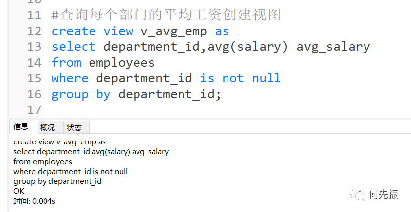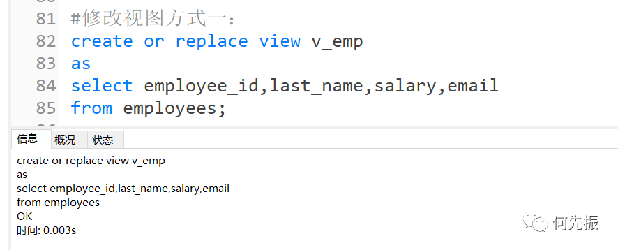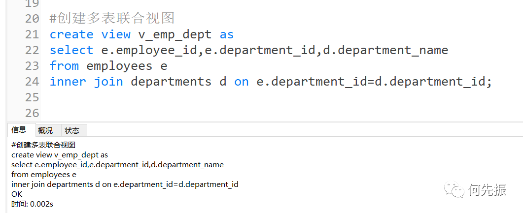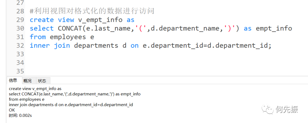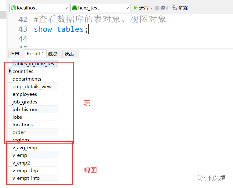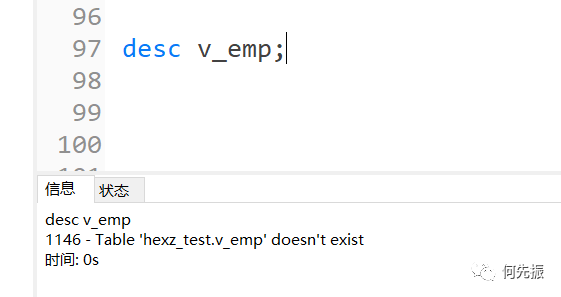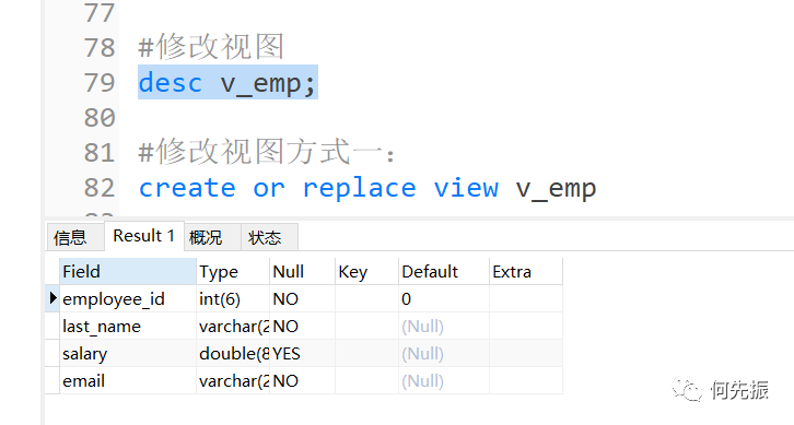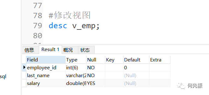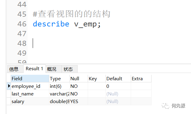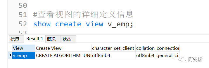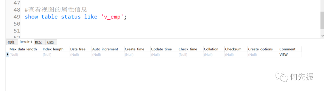 举栗子:执行结果显示,Comment为view,说明这个表是视图,其他信息为null,说明这是一个虚拟表。