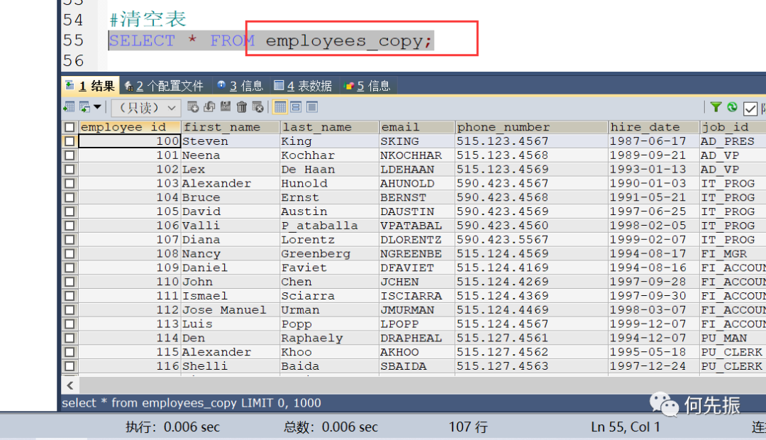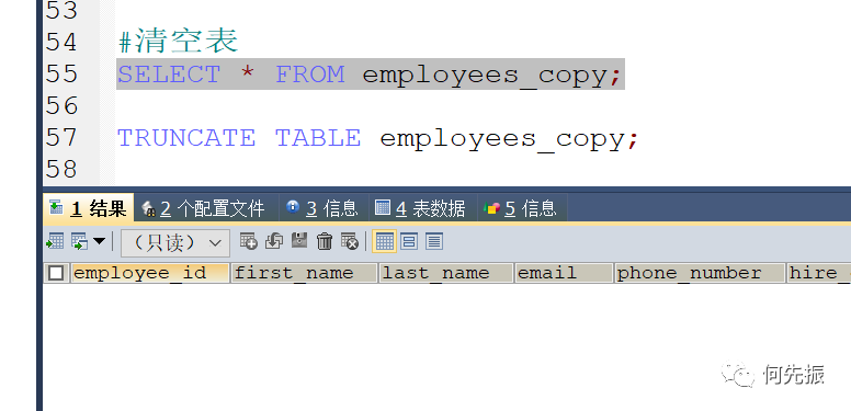 TRUNCATE TABLE:一旦执行此操作,表数据全部清除。同时,数据是不可以回滚的。
