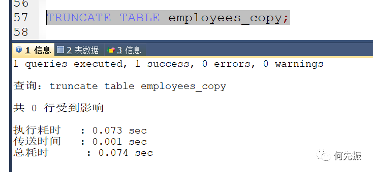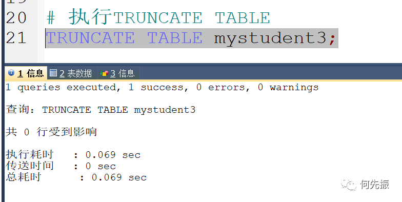 说明:TRUNCATE TABLE在功能上与不带WHERE子句的DELETE 语句相同。