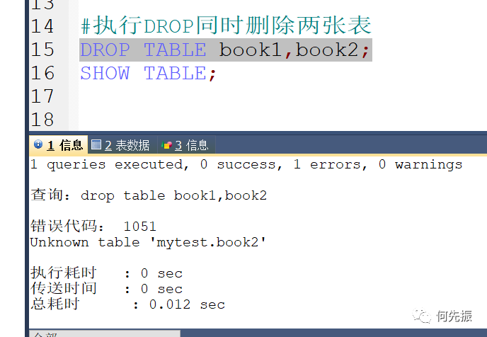 同时删除这两张表,但是只有book1这张表,没有第二张表book2所以报错