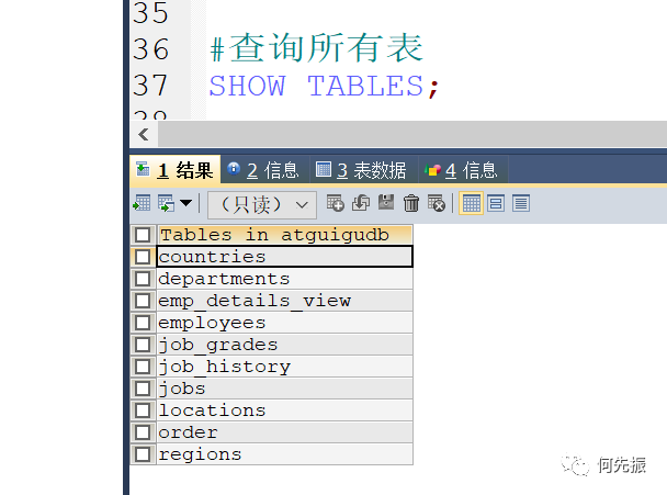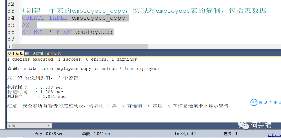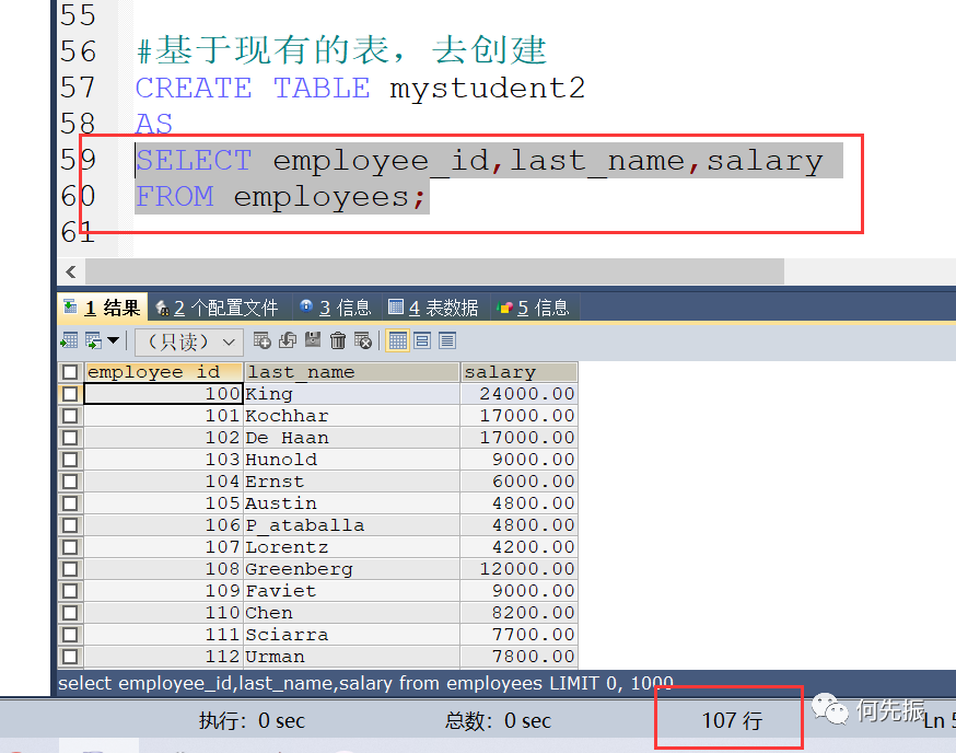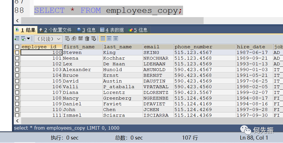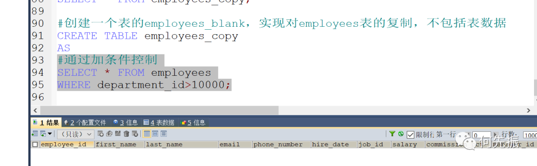 创建一个表的employees_copy,实现对employees表的复制,包括表数据