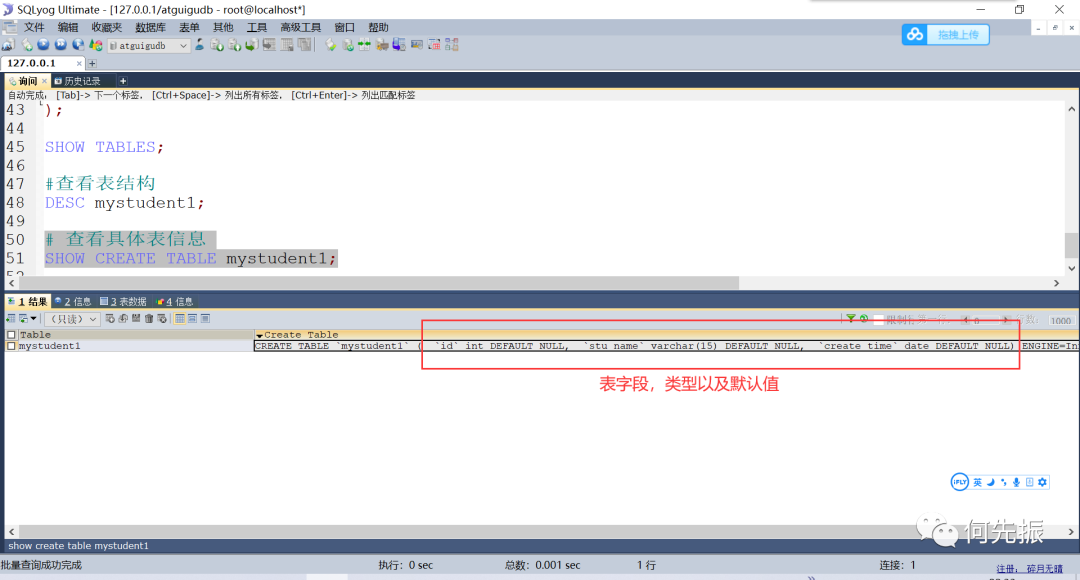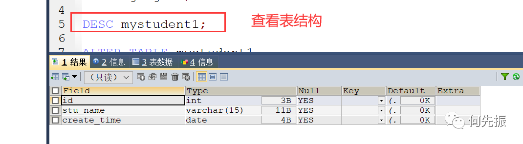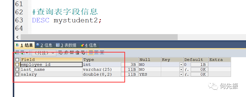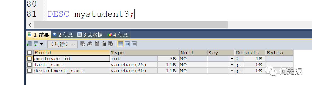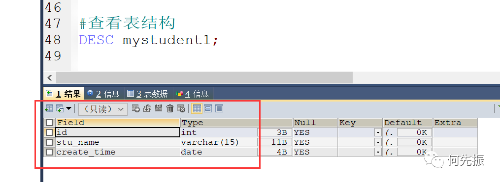 通过DESC 表名,查看表字段信息,跟原表的字段名和类型都是一样。