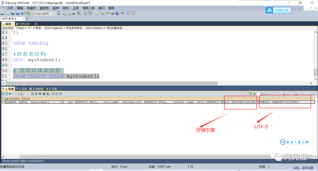 可以查看存储引擎,以及字符集,如果创建表时没有指明字符集,则默认使用数据库的字符集。因为数据库用的字符集是UTF-8,所以表也是UTF-8