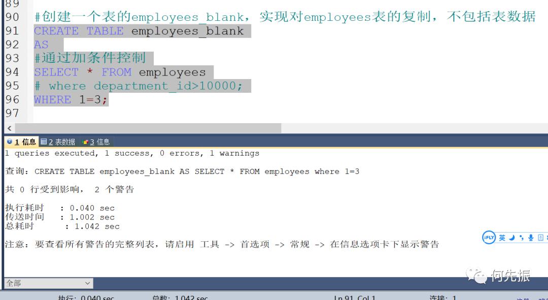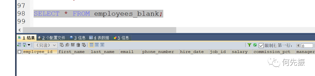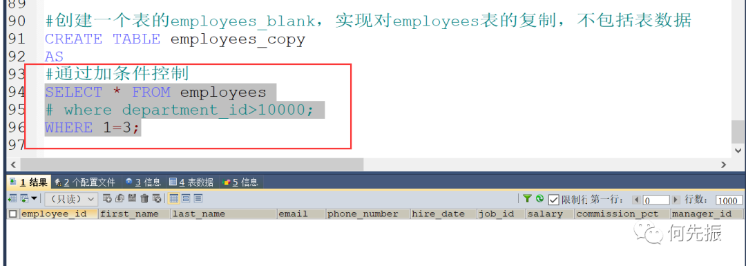 创建一个表的employees_blank,实现对employees表的复制,不包括表数据。