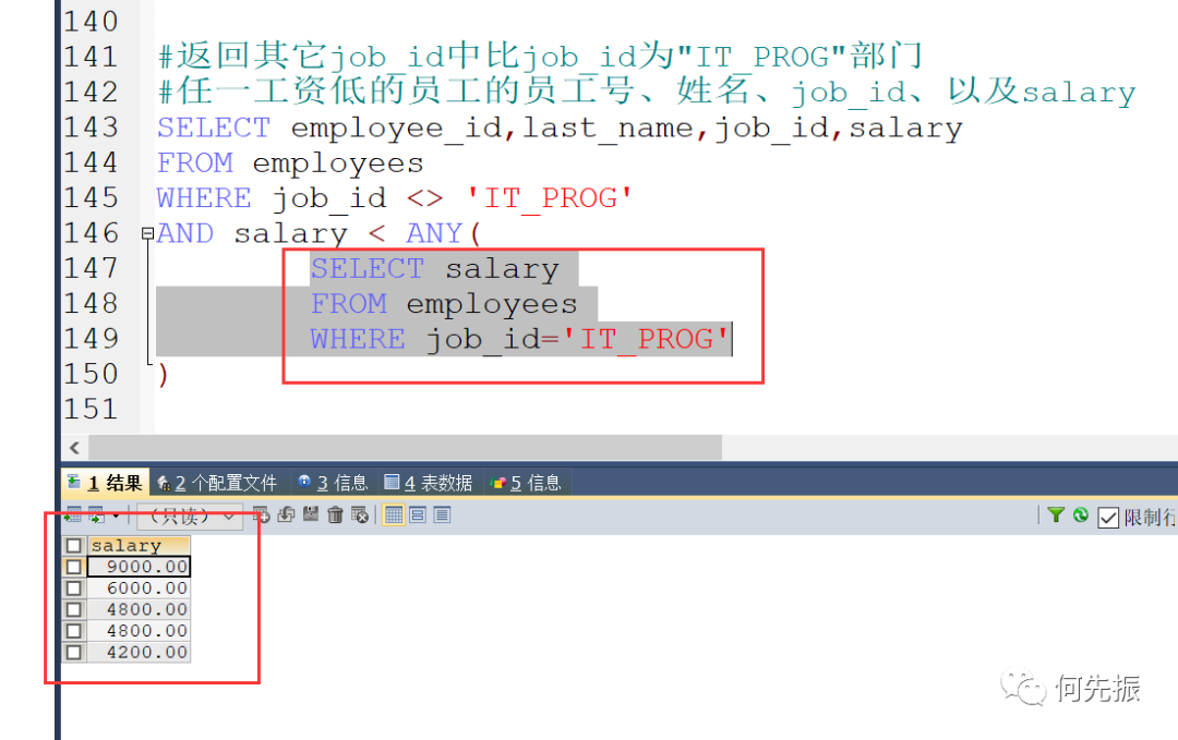 返回其它job_id中比job_id为"IT_PROG"部门任一工资低的员工的员工号、姓名、job_id、以及salary