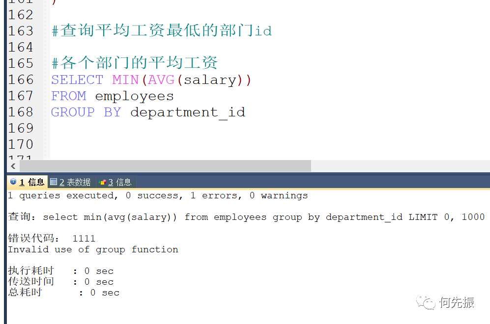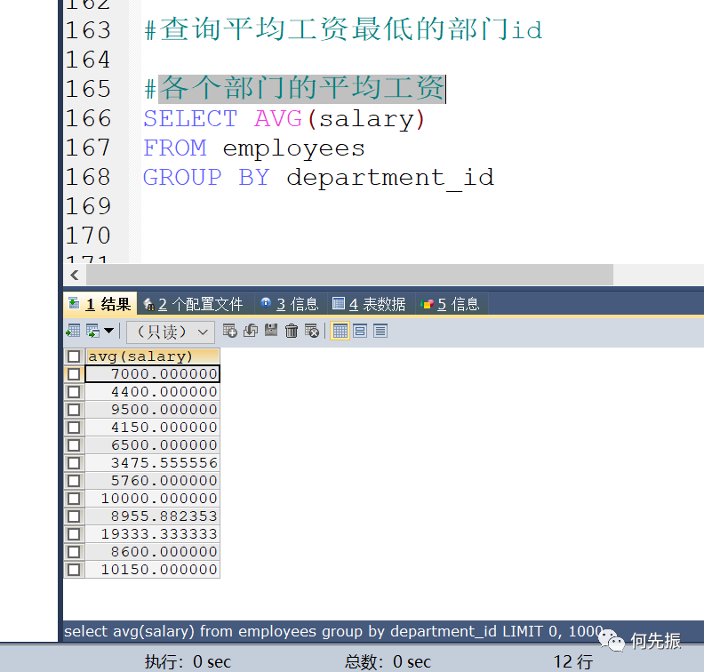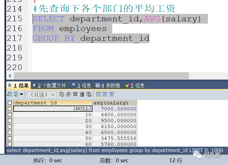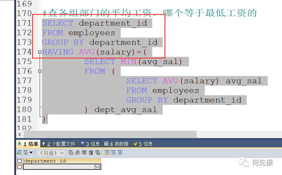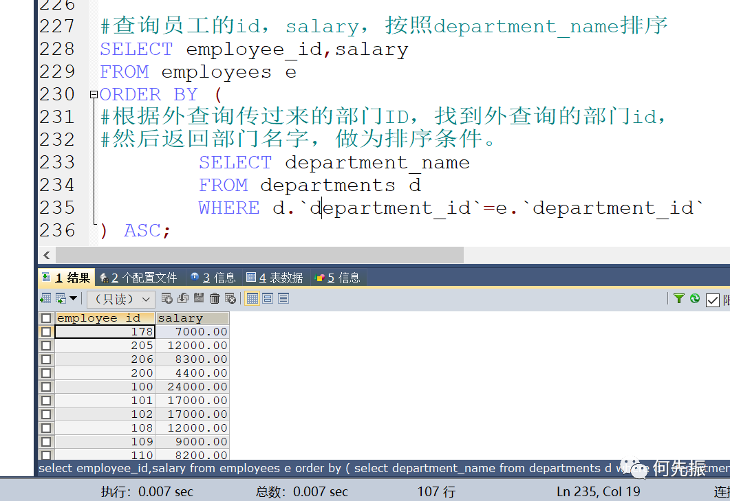 思路:外查询先查出部门id,然后传给内查询,内查询根据外查询传的部门id,计算部门的平均工资,然后跟外查询的这一行记录进行比较,满足就查询出来。