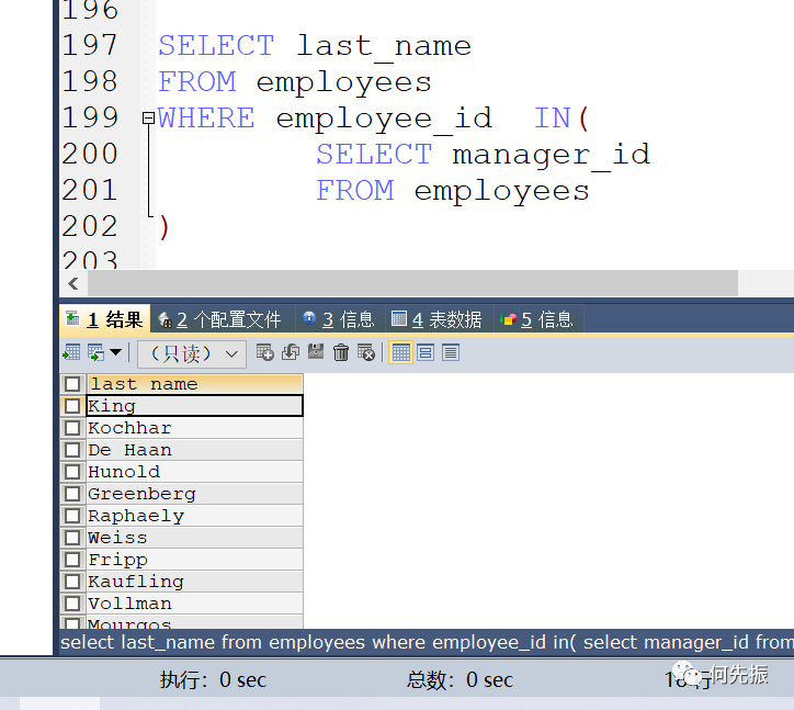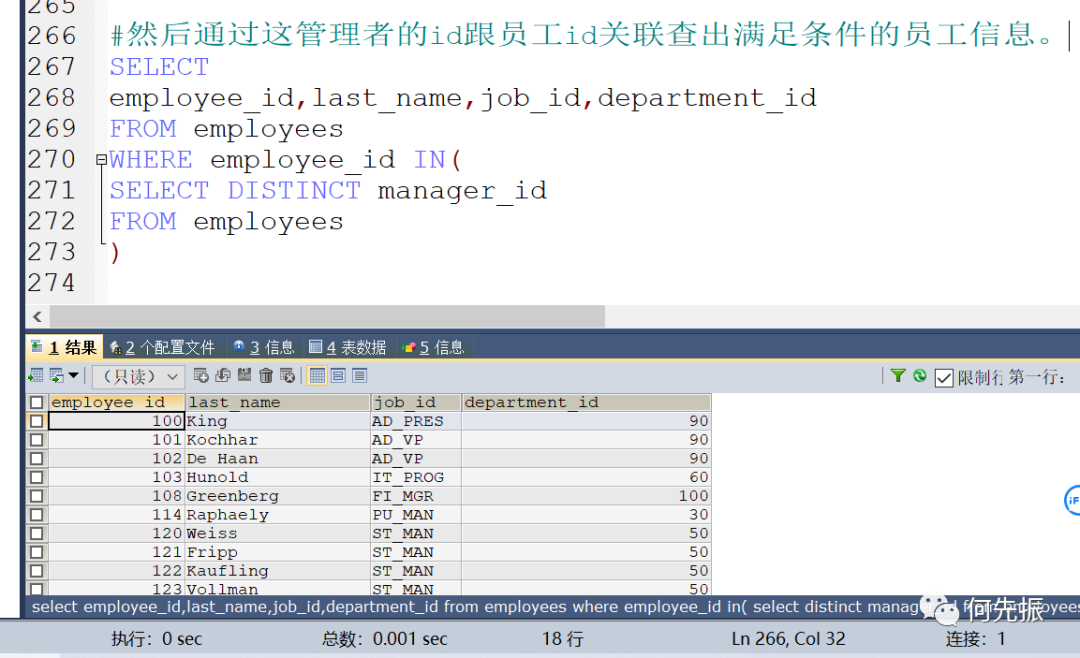 举例一:查询公司管理者的employee_id,last_name,job_id,department_id信息