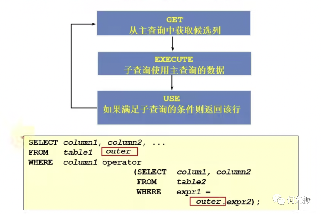 因此每执行一次外部查询,子查询都要重新计算一次,这样的子查询称之为关联子查询。