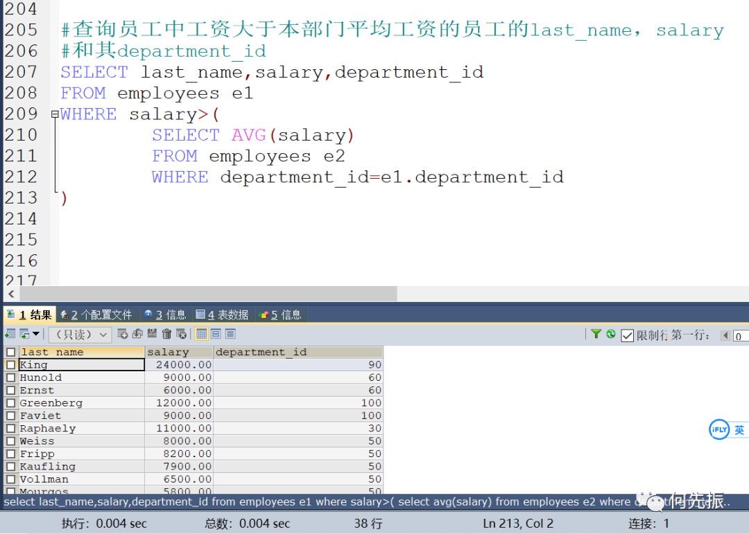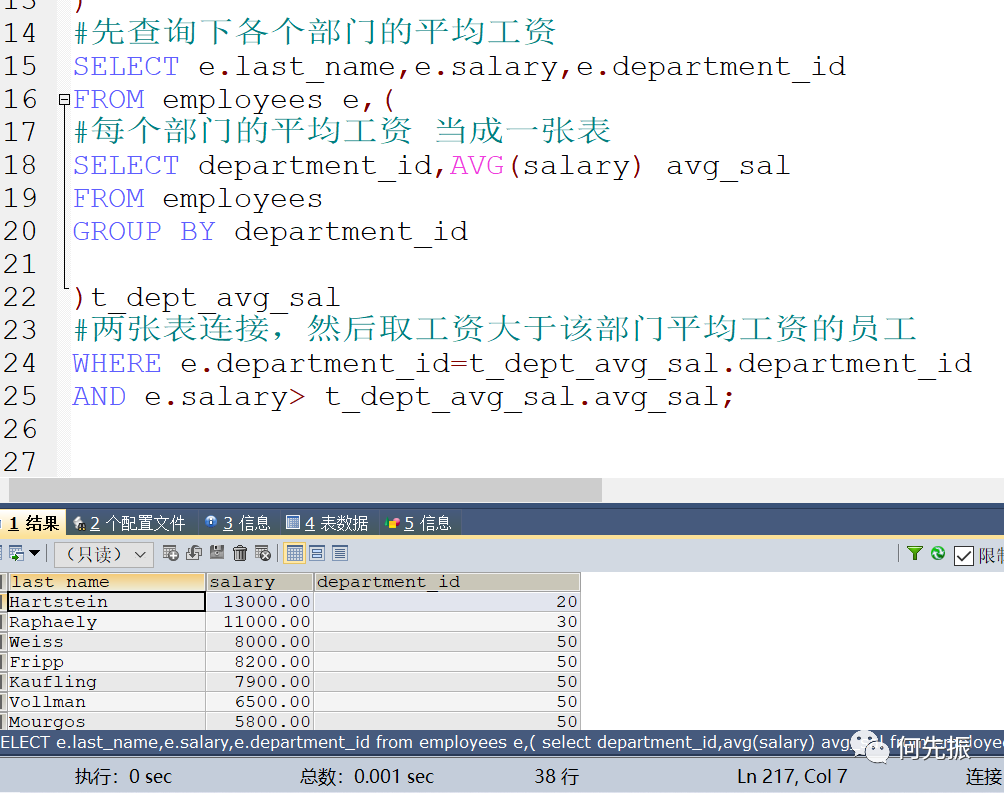 举例一:查询员工中工资大于本部门平均工资的员工的last_name,salary和其department_id。