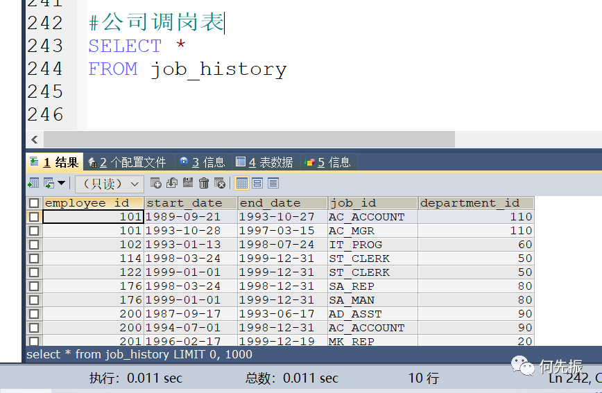 job_history 为公司调岗表,在哪个时间段,在哪个岗位工作。