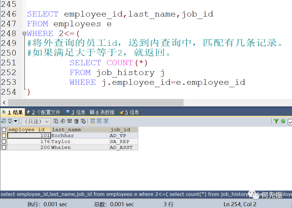 举例三:若employees表中的employee_id与job_history表中employee_id相同的数目不小于2。