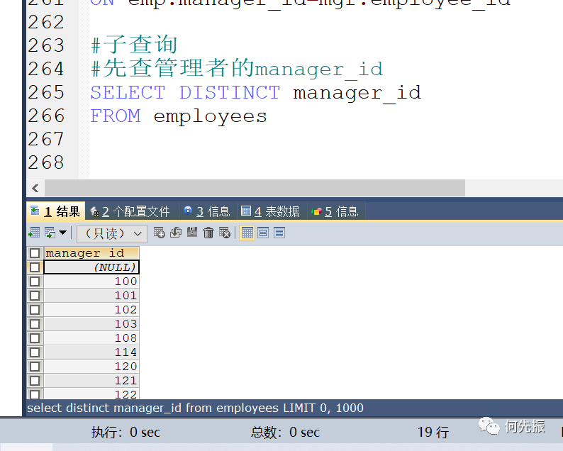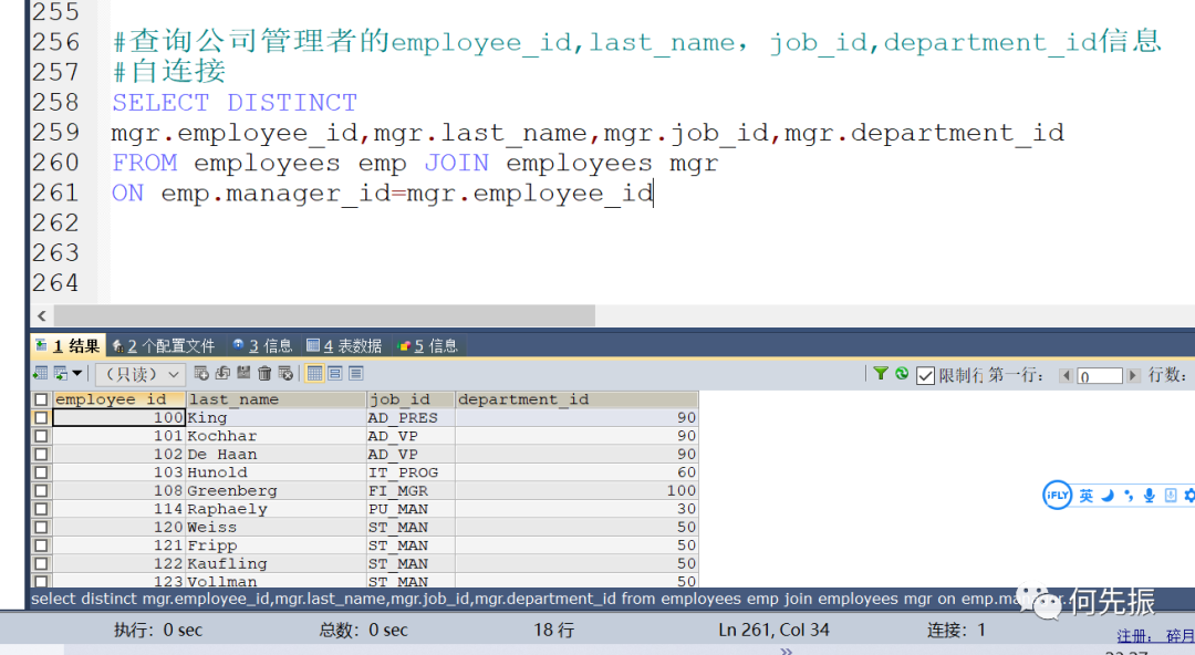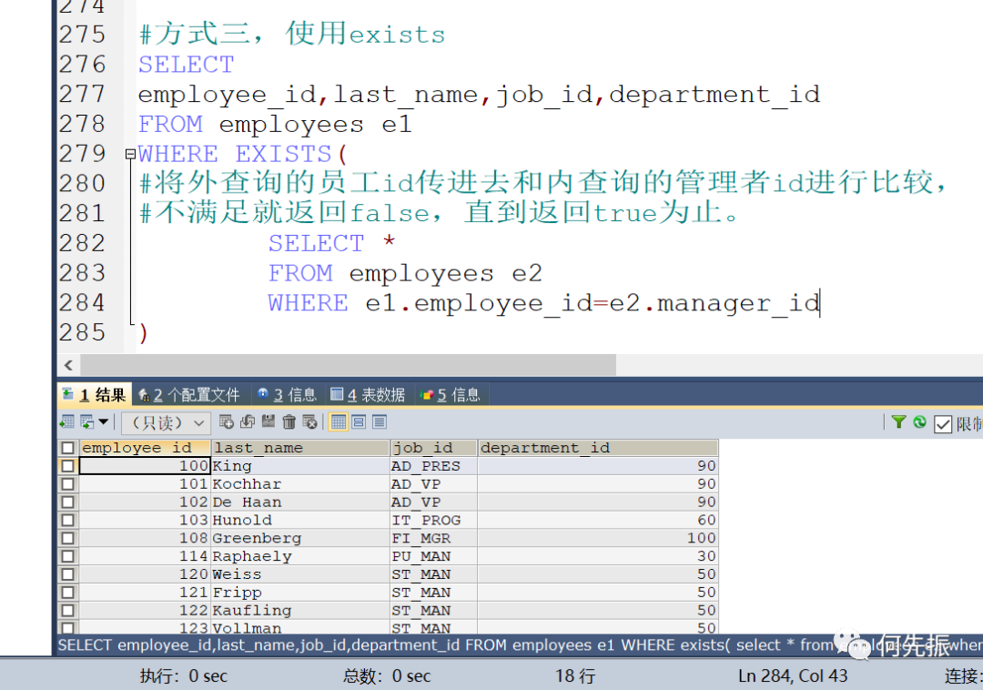 管理者的manager_id就是department_id,然后通过这管理者的id跟员工id关联查出满足条件的员工信息。