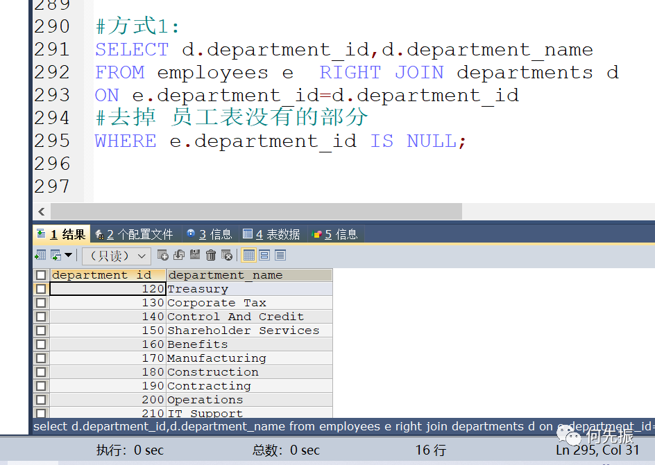员工表和部门表,右连接,然后查询出员工department_id为空的部分。
