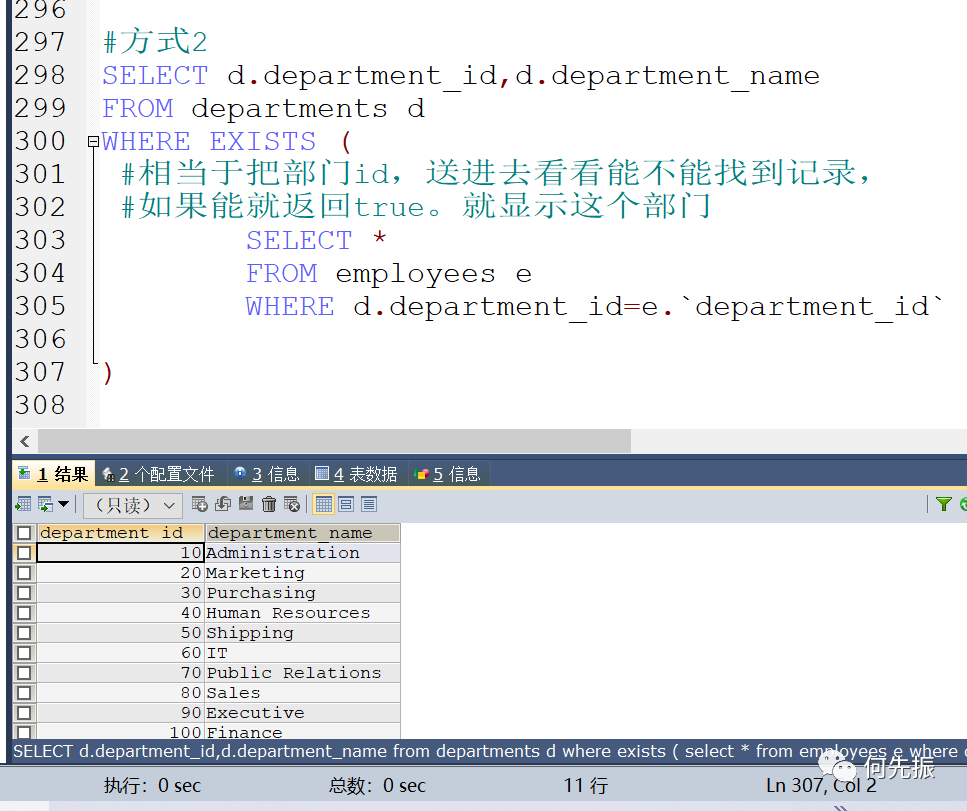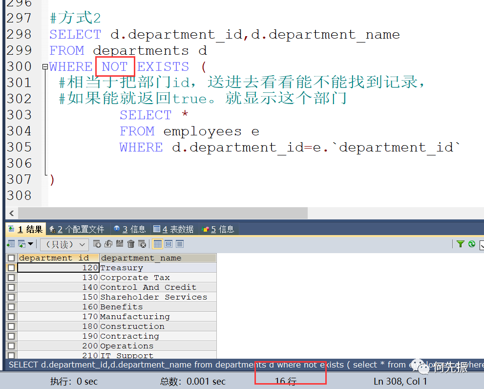 相当于把部门id,送进去看看能不能找到记录,如果能就返回true。就显示这个部门,查出11个部门是有员工的。恰好相反,我们要找那16个没员工的部门。