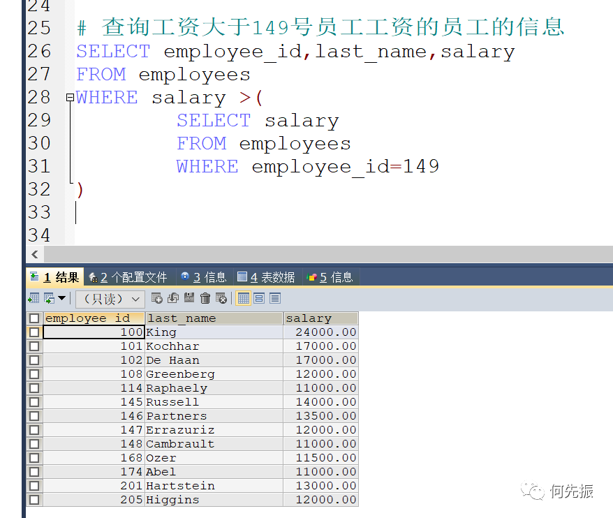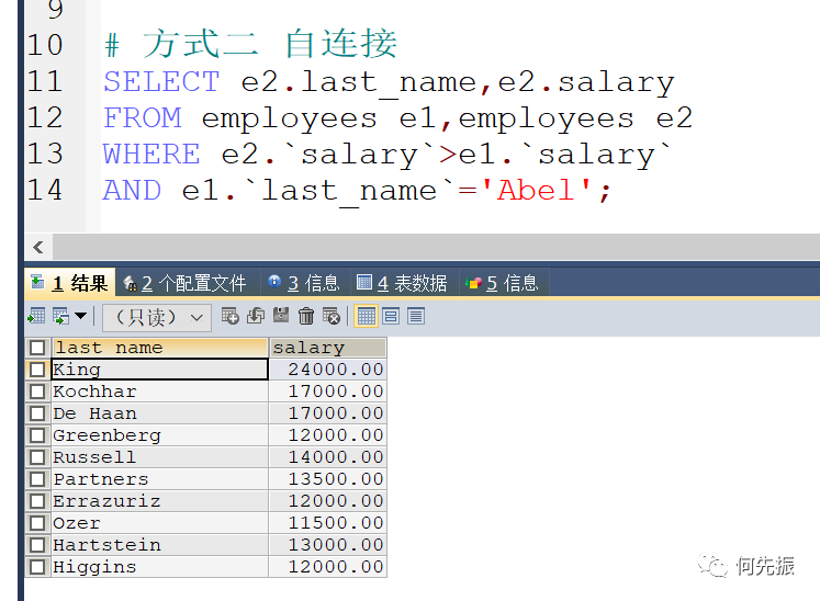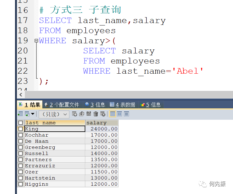 方式一:先查出Able的工资,再拿他的工资筛选比他高的,需要写两条SQL完成。