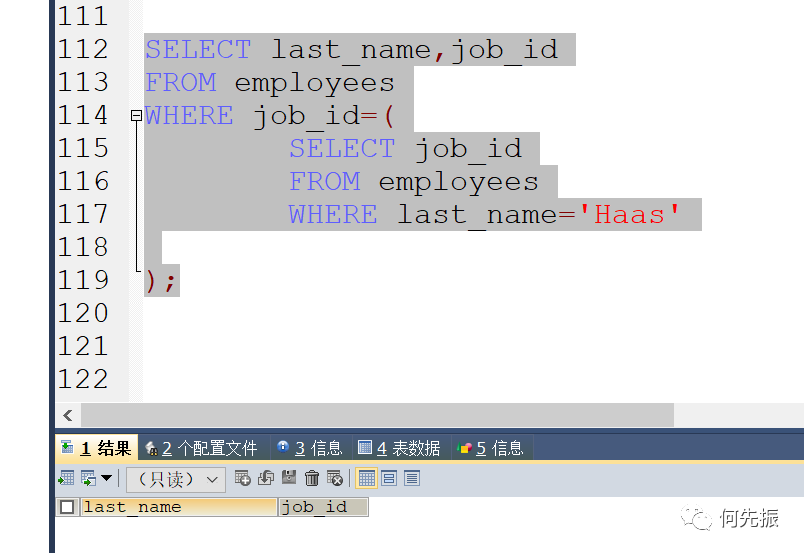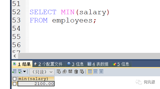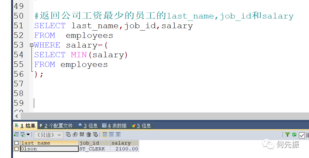 举例三:查询公司工资最少的员工的last_name,job_id和salary